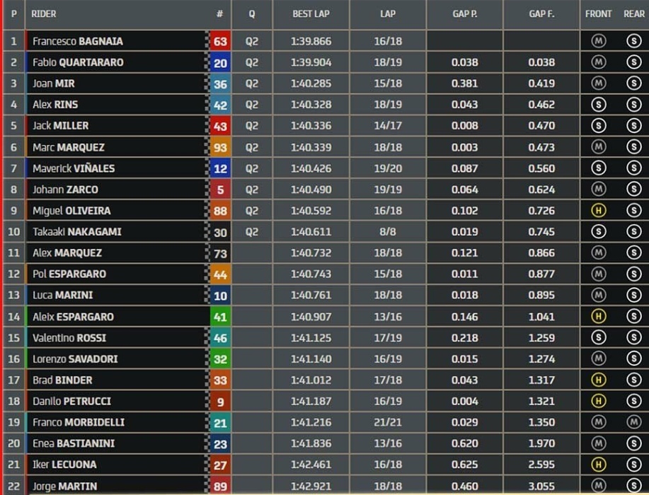 A completare la top ten sono Miller, Marquez, Viñales, Zarco, Oliveira e Nakagami. Questi piloti, in attesa delle terze libere di domani mattina, sono direttamente qualificati al Q2.