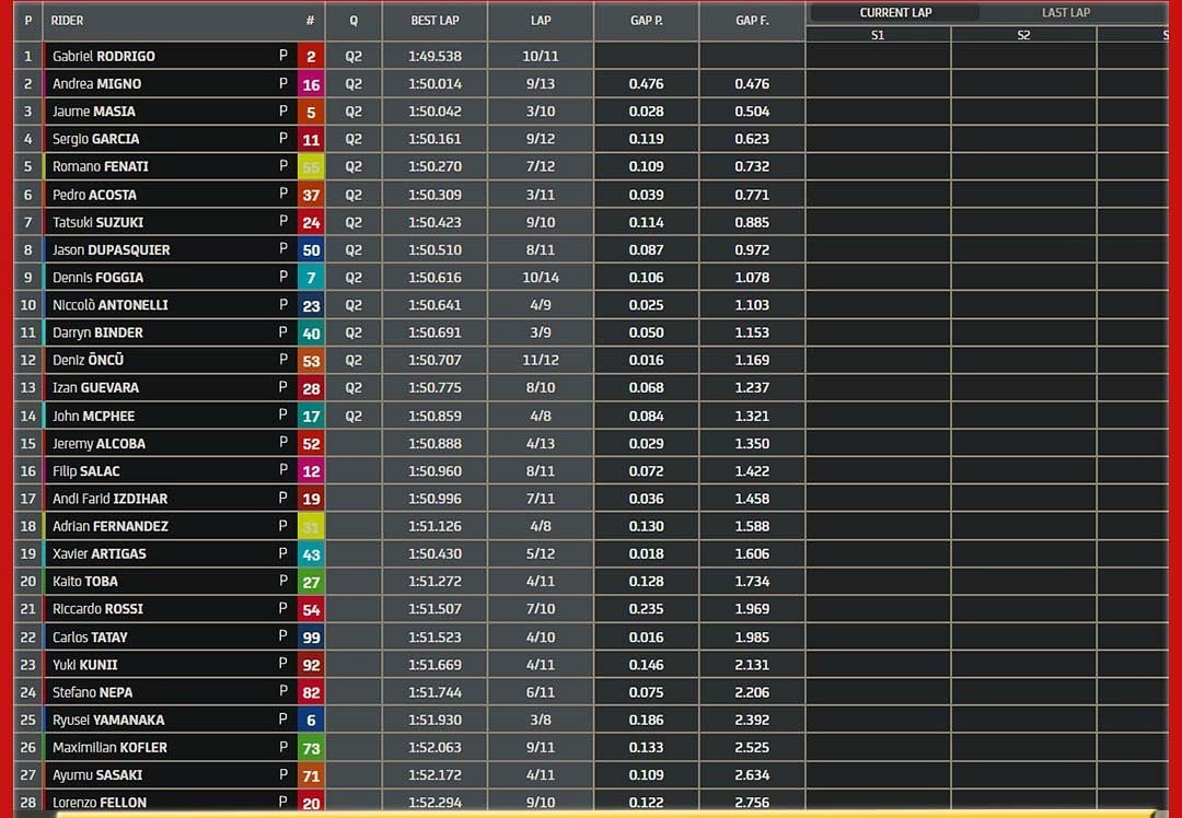 I piloti della classe inferiore sono i più sfortunati di giornata. Entrambe le sessioni sono state a tratti bagnate e i ragazzi hanno faticato a trovare feeling e informazioni per i giorni a venire. A chiudere in testa le due sessioni è Gabriel Rodrigo, l’argentino mette dietro sé Andrea Migno e Jaume Masia. 6° il leader del mondiale Pedro Acosta. Bene anche gli italiani, con Romano Fenati (5°), Tatsuki Suzuki (7°), Dennis Foggia (9°) e Niccolò Antonelli (10°) momentaneamente dentro al Q2.