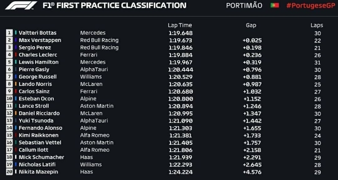 Al mattino è Valtteri Bottas a piazzarsi davanti a tutti. Il Finlandese chiude il suo giro veloce in 1’19″648. a soli 25 millesimi troviamo Max Verstappen e lo stato di grazia della Red Bull è evidenziato dal 3° posto di Perez in 1’19″846. Hamilton chiude solo 5° alle spalle di un grande Charles Leclerc, che con la Ferrari si piazza quarto a 236 millesimi da Bottas. Con l’altra Rossa Sainz invece non va oltre il 9° posto, preceduto da Norris su Mclaren, ma soprattutto da due sorprendenti Gasly (Alpha Tauri) e Russell (Williams), rispettivamente 6° e 7°. Buon esordio di Illott con l’Alfa Romeo, 17° davanti a Mick Schumacher (Haas). Ancora momento no per i tre “campioni” Alonso, Raikkonen e Vettel, rispettivamente 14°, 15°, 16°.