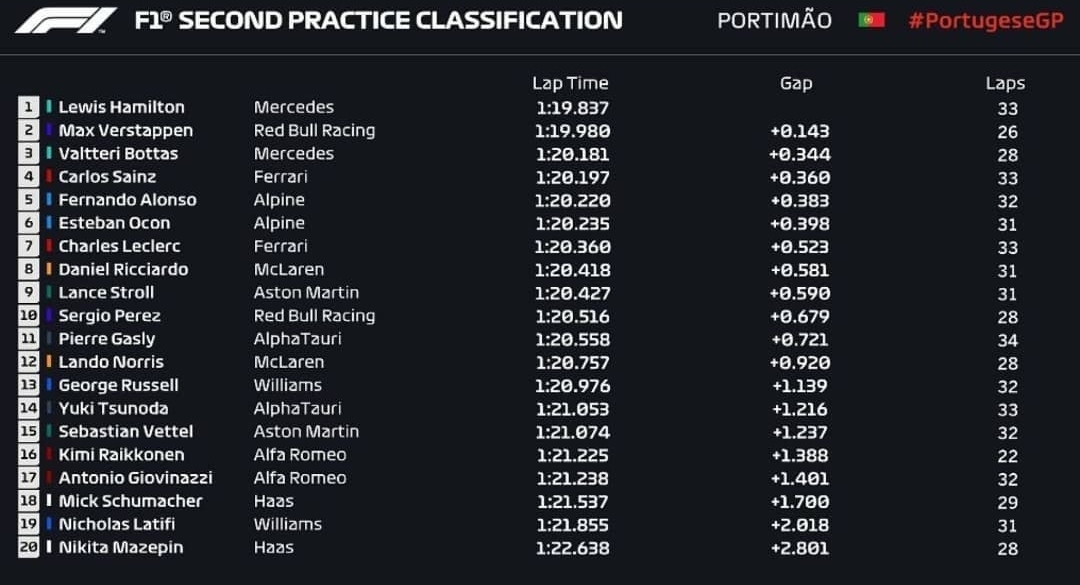 La sessione del pomeriggio ha rimesso in chiaro le gerarchie, con Lewis Hamilton che piazza il suo giro veloce. Il 7 volte campione del mondo ferma il cronometro in 1’19″847. Max Verstappen deve ancora accontentarsi del 2° posto, a 143 millesimi da “The Hammer”. In terza posizione Valtteri Bottas e dietro di lui a soli 16 millesimi la Ferrari di Carlos Sainz, che testimonia l’ottimo stato di forma della rossa, con Leclerc 7° a 5 decimi dalla vetta. A “sandwich” tra le due Ferrari troviamo le due Alpine di Alonso e Ocon. Ancora guai per Sebastian Vettel con la Aston Martin, che replica il 16° tempo delle FP1 alle spalle di Raikkonen