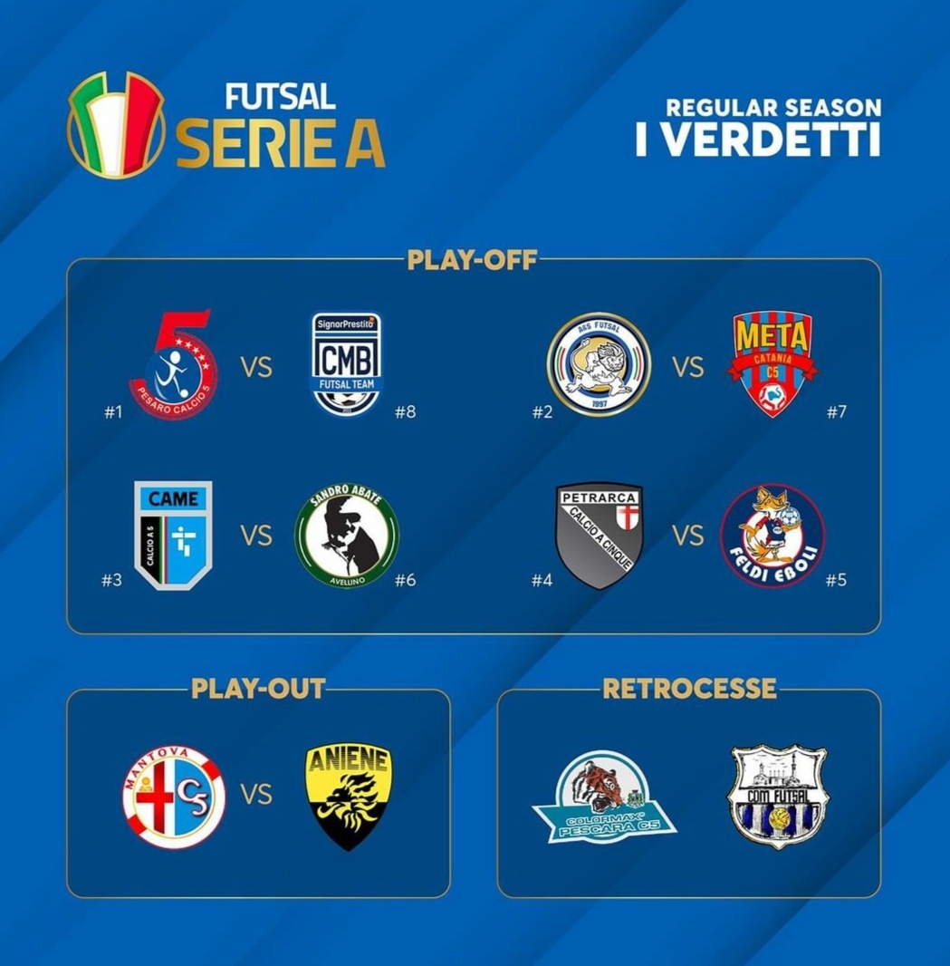 La capolista Pesaro batte 4-2 la Came Dosson. I campioni d’Italia nei quarti dei playoff se la vedranno con la Signor Prestito, che però nel match di Sabato è uscita sconfitta per 7-3 in casa del Lido di Ostia. Questa vittoria permette ai laziali di ottenere la salvezza e evitare i playout, ai quali parteciperanno, Mantova, che non va oltre l’1-1 col Padova, e Aniene, che chiude la regular season con una vittoria esterna 4-7 ad Avellino. Salvezza ottenuta anche per il Real San Giuseppe, 3-6 alla già retrocessa Genova. Pescara invece saluta la A con un 3-3 contro Eboli e infine clamoroso Ko per l’Acqua e Sapone, battuta da Catania 3-2.