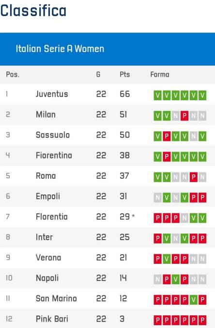 Il Napoli con la sconfitta del San Marino conquista matematicamente la salvezza, tuttavia chiudere il campionato con un pareggio contro la Roma finalista di Coppa da un gusto completamente nuovo a questi ultimi novanta minuti. Le azzurre di Pistolesi nonostante la salvezza già acquisita giocano a viso aperto e non si arrendono al vantaggio delle giallorosse firmato da Linari al 21esimo e al raddoppio di Thomas al 61esimo e rimontano la partita con il gol 64esimo di Rijsdijk e il rigore di Huchet all’88esimo. La Roma ha l’occasione di riportare la partita a proprio favore con il rigore di Giugliano al 96esimo dato per fallo di mano di Cafferata, ma il portiere del Napoli Pèrez para e tiene sul 2-2. La Roma con questa altra rimonta subita perde il quarto posto a favore della Fiorentina e mette ulteriormente in evidenza come la tenuta mentale sia il punto debole delle ragazze di Bavagnoli e dovrà essere il primo punto su cui lavorare dopo la finale di coppa.