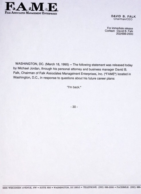 18 Marzo 1995: una frase, tre parole, sei lettere. Sei lettere che pesano come un macigno: David Falk, agente di Michael Jordan, fa uscire un comunicato ufficiale con tre semplicissime parole, dettate dal suo assistito: I’m back.