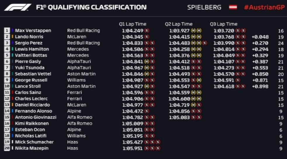 Si rimane in Austria anche per questo Gran Premio della Formula 1 che riparte dalla vittoria schiacciante di Max Verstappen, pronto a far ripetere lo stesso copione anche per questo weekend con una grandissima pole. Eroico Russell con la Williams con la nona posizione, Ferrari strategica nel rinunciare alla Q3 per raccogliere di più in gara.