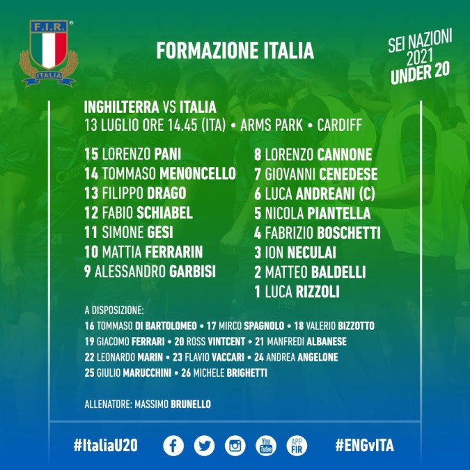 Il match inaugurale dell’ultimo round della competizione ci sarà ancora una volta l’Italia, che alle 14:45 in diretta su Sky Sport Arena sfiderà l’Inghilterra, alla quale basterà solamente un punto per salire sul trono europeo in caso di vittoria irlandese. Sei le sostituzioni nella formazione azzurra rispetto alla partita persa 30-27 contro l’Irlanda. Triangolo allargato formato da Pani, Gesi e Menoncello, spostato all’ala, con Schiabel che partirà dal primo minuto come primo centro, affiancato da Drago come secondo. In mediana Ferrarin e Garbisi preferiti ad Albanese e Marin, che partiranno in ogni caso dalla panchina. In terza linea Cenedese prenderà il posto di Vintcent assieme a Cannone e capitan Andreani, mentre in seconda linea saranno presenti Piantella e Boschetti. In prima linea Neculai, Baldelli e Rizzoli.