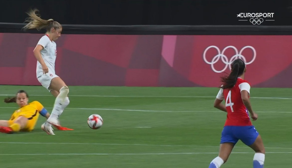 Il Canada dopo il pareggio con il Giappone vuole portarsi a casa la prima vittoria olimpica e parte subito a mille pressando a tutto campo e raggiungendo in diverse occasioni la porta. Infatti al 6’ il difensore canadese Buchanan segna il gol del 1-0 ma poi viene annullato per fallo di mano, al 16’ al Canada viene concesso il calcio di rigore per il fallo di Pardo su Sinclair ma Beckie sbaglia mandando la palla sul palo esterno. Tuttavia la 26enne del Manchester City al 37’ riesce a farsi perdonare segnando il gol dell’1-0 intercettando la respinta con i pugni di Endler sul cross dalla destra di Prince. Nel secondo tempo la situazione non cambia, in apertura di secondo tempo si rende protagonista ancora Beckie che scarta il portiere Endler e segna a porta vuota, al 52’ il Chile prova a riaprire la partita col rigore trasformato da Araya per il fallo di Zadorsky su Zamora e si affaccia più volte alla porta di Sheridan per trovare il pareggio, ma la partita termina 2-1 per il Canada che a parte la leggerezza difensiva che ha portato al rigore non è mai stato concretamente in pericolo.