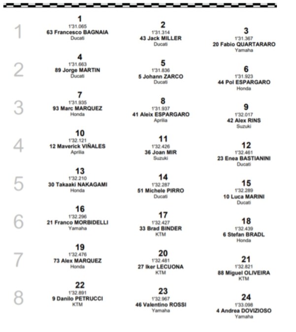 Come detto il poleman è il nostro Pecco Bagnaia, che col suo giro capolavoro mette la ciliegina sulla torta della festa Ducati, che a casa nostra mette quattro piloti nelle prime cinque posizioni.