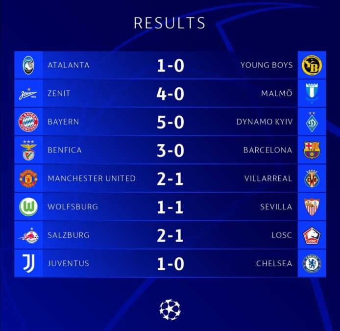 Si conclude la seconda giornata di Champions League con 8 incontri entusiasmanti e ricchi di sorprese. L’Atalanta e la Juventus vincono, entrambe per 1-0, e riportano in positivo il bilancio delle italiane in questa giornata, che era iniziata con il pari dell’Inter e la sconfitta, beffarda, del Milan. Il Bayern Monaco si conferma una macchina da gol demolendo per 5-0 la Dynamo Kyev, bene anche: Zenit, che vince 4-0 contro il Malmo; Salisburgo che batte 2-1 il Lille; e Manchester United che si rialza dopo la sconfitta della prima giornata vincendo 2-1 ai danni del Villarreal. Sprofonda il Barcellona di Koeman, che esce dal Da Luz con un passivo di tre reti subite e resta ultimo a zero punti nel proprio girone. Pareggio per 1-1 tra Siviglia e Wolfsburg.