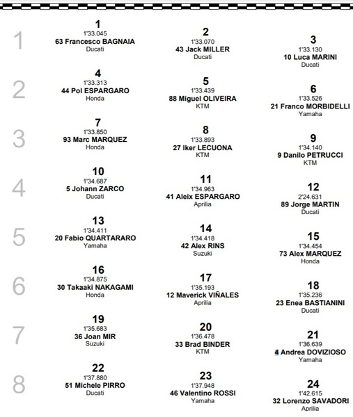 Subito dopo il poleman troviamo un’altra Ducati, quella di Jack Miller che con un’ottima qualifica è riuscito ad ottenere la seconda casella. In terza posizione troviamo invece una sorpresa: sarà infatti Luca Marini a chiudere la prima fila. L’Italiano è autore di una qualifica perfetta che gli ha consentito di togliersi più di una soddisfazione. Troviamo invece in quarta, quinta e sesta posizione rispettivamente Pol Espargaro, Miguel Oliveira e Franco Morbidelli, solo 7° Marquez che è finito anche in ghiaia. In quarta fila le due Ducati Pramac di Zarco e Martin
