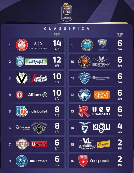 La classifica: di seguito la classifica. Per la LBA è tutto, appuntamento a settimana prossima!