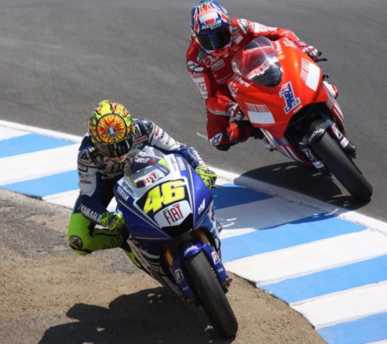 Il 2008 deve essere l’anno del riscatto. Dopo la prima metà di stagione il duello iridato è ancora tra Valentino Rossi e Casey Stoner. Rispetto allo scorso anno però si ha un vero e proprio testa a testa tra il numero 46 e l’australiano, che raggiunge il culmine a Laguna Seca. Stoner in pole, Rossi dietro. In gara sorpassi e controsorpassi, con Valentino che per sopravanzare il campione in carica va a tutta velocità sulla ghiaia nel “cavatappi” compiendo una magia decisiva per la vittoria di quel gran premio, in cui tra l’altro Stoner cade arrivando comunque 2°. Quell’impresa sarà la chiave del ritorno al vertice di Rossi.