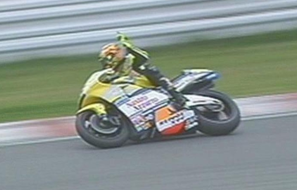 Un anno più tardi poi a Donington Vale vinse il Gp di Gran Bretagna davanti a Biaggi. Il Pesarese a fine gara festeggiò mettendosi di traverso sulla moto ma il pilota romano gli passò a due millimetri sul traguardo rischiando di farlo cadere. A parco chiuso Rossi replicherà così al gesto di Biaggi: “Lui è solito fare queste stronzate. Evidentemente gli tira il culo arrivar dietro tutte le domeniche!”