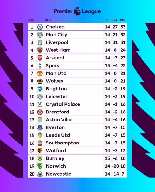 Si consolida al quarto posto a quota 24 punti il West Ham di David Moyes, che però non va oltre l’1-1 interno contro il Brighton. l’Arsenal non ne approfitta per prendersi momentaneamente l’ultimo posto valevole per la qualificazione diretta in Champions, e perde contro il Manchester United al culmine di una partita tirata, e decisa da un campione quale Cristiano Ronaldo: doppietta, 3-2 finale, 130 gol con i Red Devils e 801 in carriera, per dare il benvenuto al nuovo allenatore Ralf Rangnick. CR7 and co tornano alla vittoria in campionato dopo tre turni e salgono al settimo posto con 21 punti. Sesta piazza con 22 punti per il Tottenham di Conte, che vince ancora e lo fa tra le mura amiche contro il Brentford, battuto 2-0.