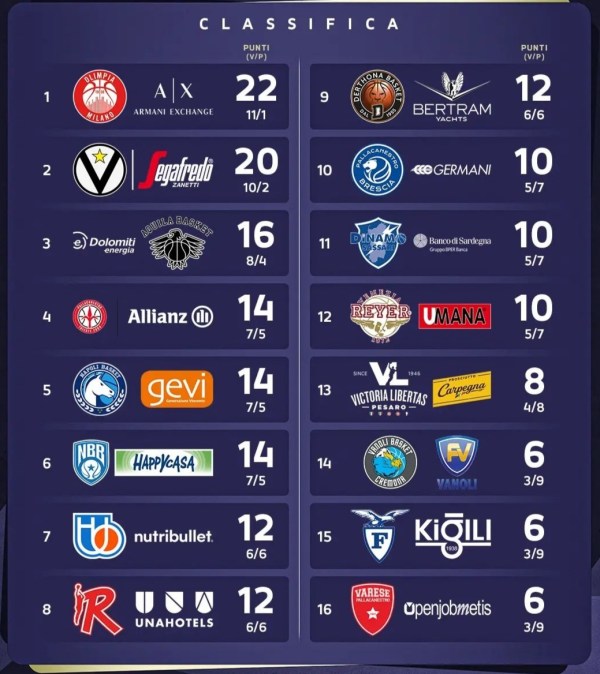14 punti anche per Brindisi, che torna a vincere piegando all’over time Treviso, che così viene agganciato al settimo posto dalla Reggiana, vittoriosa a Pesaro, e da Derthona, che ha battuto Venezia tra le mura amiche. Vince ancora la Dinamo Sassari, allontanatosi ulteriormente dalla zona critica con la vittoria su Varese, ultima a pari merito con la kigili e la Vanoli Cremona, sconfitta da Brescia.