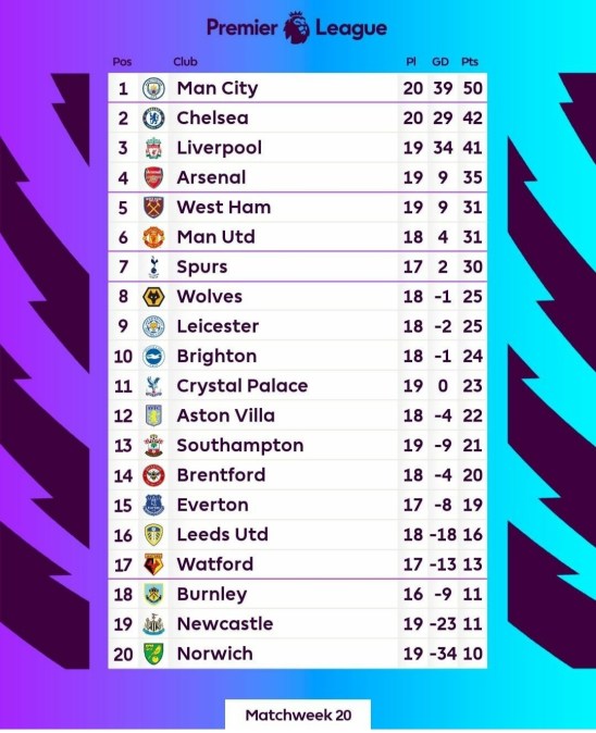 Mentre i Citizens tentano la fuga, si infiamma anche la lotta europea, con l’Arsenal che dopo un inizio di stagione disastroso continua a vincere insediandosi in quarta posizione a +4 sul West Ham, che con la larga vittoria (4-1) sul campo del Watford (diciassettesimo con 13 punti) manda un chiaro messaggio ai Gunners per la conquista dell’ultimo posto valevole per la qualificazione in Champions League, per il quale si fanno sentire anche il Manchester United, a pari punti con gli hammers, e il Tottenham, che con tre partite in meno è a -5 dalla squadra di Arteta. In questa giornata i Red Devils hanno battuto 3-1 il Burnley, mentre gli Spurs sono stati fermati dall’arcigno Southampton sull’1-1. Con il pareggio strappato agli uomini di Conte, i Saints salgono a quota 21 al tredicesimo posto, a +10 sulla diciottesima piazza occupata dal Burnley a pari merito con il Newcastle. Chiude la graduatoria il Norwich con 10 punti, sconfitto sonoramente (3-0) anche dal Crystal Palace di Vieira, undicesimo a quota 23.