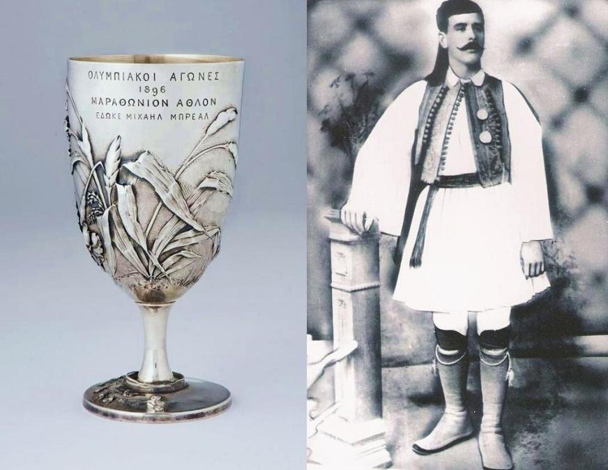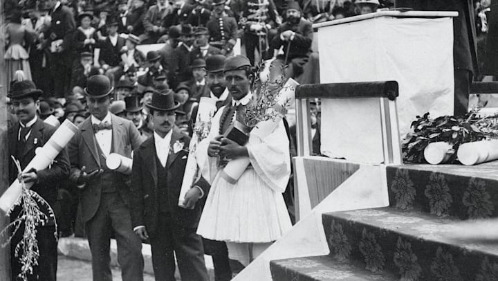 Spiridon Louis, il 25 marzo 1896, si piazzò al 17° posto nella gara di qualificazione per la maratona delle Olimpiadi, ma solo i primi 16 atleti vennero ammessi alla maratona. Il sindaco di Atene, che era anche il colonnello di Spiridon, convinse la giuria a farlo partecipare comunque alla competizione olimpica. La Maratona si svolse il 10 aprile 1896. Spiridon Louis aveva solo 23 anni e si presentò alla partenza indossando le scarpe che i suoi compaesani gli avevano regalato. I partecipanti erano prevalentemente greci, più un ungherese, un francese, uno statunitense e un australiano. La gara venne disputata dalla piana di Maratona, lo storico luogo in cui avvenne la battaglia del 490 a.C. tra Ateniesi e Persiani, fino al centro della città: in tutto circa 40 chilometri, percorsi in 2 h 58′ 25”. Poi, nel 1921, la distanza della maratona moderna venne stabilita in 42,195 Km. Una gara dal grande valore storico per i Greci, in quanto rievocava la corsa di Filippide dalla città di Maratona fino ad Atene per annunciare la vittoria sulla Persia. All’arrivo, nello stadio, l’atmosfera era molto tesa. Un messaggero in bicicletta arrivò con la notizia che Flack era al comando. Poi giunse un’altra notizia: Spiridon era in testa. Quando il nuovo eroe greco entrò per primo nello stadio olimpico, il pubblico di casa esplose di gioia. L’entusiasmo fu tale che anche i due principi della casa reale greca, il principe Costantino e il principe Giorgio, entrarono nella pista per accompagnarlo fino al traguardo, con 7 minuti di vantaggio rispetto il secondo, il favorito Kharilaos Vasilakos. Il terzo era Spiridon Belokas che fu poi squalificato per aver fatto parte della gara trasportato da un carretto. Dopo la vittoria, gli abitanti della città natale di Louis, facevano a gara per offrire al trionfatore pranzi e doni di ogni genere. L’atleta accettò soltanto un carretto ed un cavallo per proseguire la sua attività di caricatore di acqua. Spiridon poi continuò a condurre una vita molto modesta e, nel 1927, dopo la morte della moglie, cadde in miseria per una serie di sfortunate circostanze.