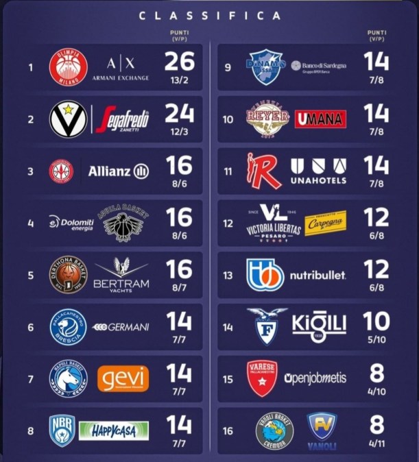 Si conclude anche la quattordicesima giornata di LBA, e il quadro delle prossime final eight si sta per definire L’ultimo turno ha decretato la quantificazione alla prossima Coppa Italia di febbraio altre tre squadre, che raggiungono Olimpia e Virtus Bologna: Trieste, Trento e Tortona. l’Allianz, nonostante la sconfitta contro la Reggiana, rimane al terzo posto, a pari punti proprio con l’aquila, sconfitta a Sassari, e Derthona, che ha battuto Cremona tra le mura amiche. Rimangono solo tre biglietti per Pesaro: al sesto posto c’è la Germani, a pari punti con Brindisi, Napoli, Venezia, Sassari e Reggio, in una sfida da tenere assolutamente d’occhio.