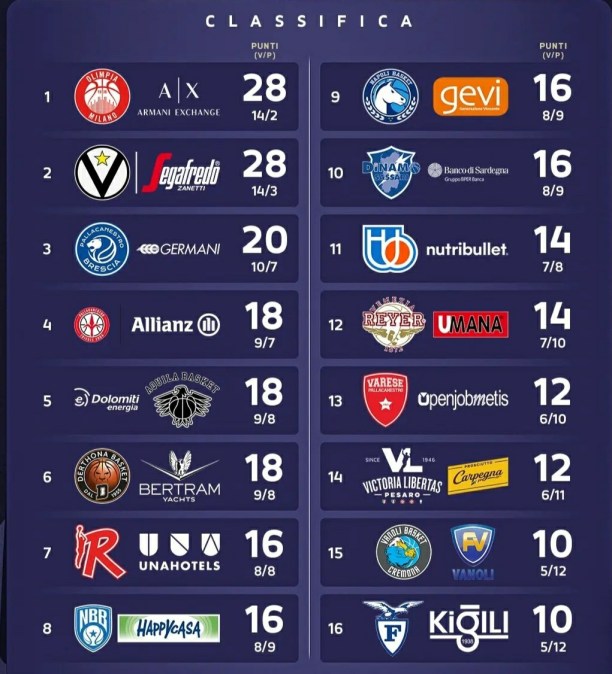 Dall’undicesimo posto occupato a pari merito da Treviso, due partite in meno, e Venezia, all’ultimo occupato in compartecipazione dalla Kigili e da Cremona con 10 punti ci sono solo quattro lunghezze di distanza: Varese sale a 12 insieme a Pesaro, sconfitto proprio dalla Nutribullet.