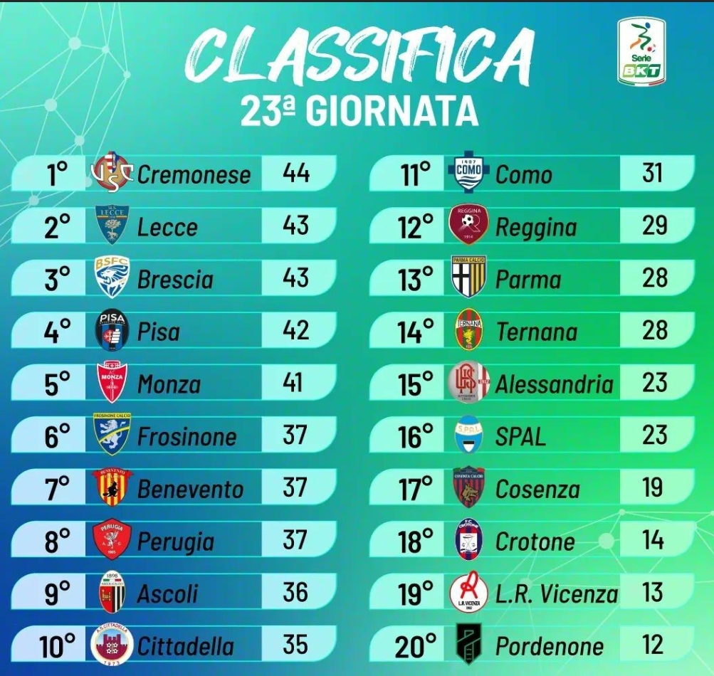 Il Brescia vince di misura a Crotone, 0-1, sopravanzando il Pisa in classifica e portandosi in terza posizione. Medesimo risultato per il Monza a Terni, i brianzoli hanno ora fatto lo scatto definitivo per agganciarsi al gruppo di testa in lotta per la Serie A. Delude il Frosinone che, in casa, perde 1-2 con il Como. Ancora peggio il Benevento, crisi nera per i campani che non vincono da 5 partite ed incassano uno 0-2 dall’Ascoli. Importante vittoria del Perugia a Cosenza, umbri che rimangono in corsa per i playoff. Lo stesso si può dire per il Cittadella che rimane aggrappato al treno grazie allo 0-1 sul Pordenone. Bene la Reggina che esce un po’ dalla zona rossa della classifica vincendo 1-3 in casa della Spal. Estensi senza vittoria da 7 giornate, sempre più delusione di questo campionato.
