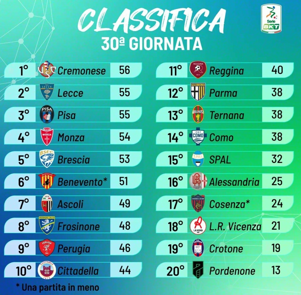 Un punto a testa tra Brescia e Benevento. Il match del Rigamonti si conclude sul 2-2. Pareggio che non cambia le gerarchie per quanto riguarda la classifica. Malissimo il Frosinone che perde 2-0 sul campo del Crotone. Calabresi che ora tornano a -5 dalla zona playout. Il Perugia viene rimontato al 94′ dalla Spal cestinando l’occasione di entrare in zona playoff. Cittadella e Reggina non si fanno male, al Tombolato finisce 0-0, un punto a testa che in realtà non fa felice nessuno. Titino regala la vittoria al Parma sul Vicenza. Finisce 0-1 al Menti con i veneti che falliscono l’occasione di agganciarsi alla zona playout. Pareggiano 1-1 Como e Ternana, ormai salve e ad “obiettivo stagionale” raggiunto.