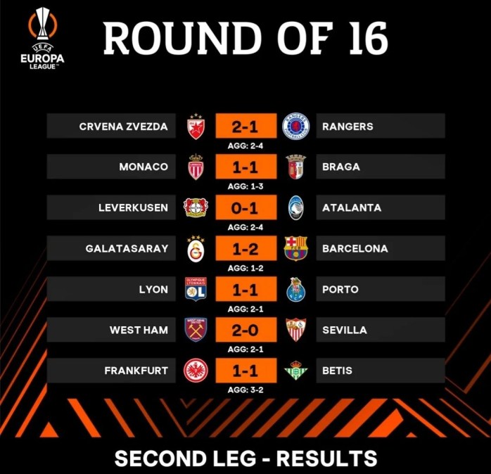 Stella Rossa- Rangers All’andata i Rangers avevano già messo in cassaforte la qualificazione con la vittoria per 3-0 e in Serbia le speranze sono poche. La Stella Rossa ci prova ugualmente e si porta in vantaggio con Ivanic, ma al 56′ il gol del pareggio di Kent soffoca tutte le speranze di rimonta della squadra di Belgrado, che comunque riesce almeno a chiudere la sua competizione in bellezza con una vittoria grazie alla rete al 93′ con Ben, che dal dischetto non sbaglia. Vince la Stella Rossa, ma sono i Rangers a strappare il pass per i quarti di finale.Grande attesta per i sorteggi che ci regaleranno i quarti di finale, noi saremo sempre qui a raccontarvi tutto.