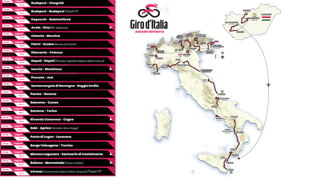 Quello che inizierà oggi è, come ha anche dichiarato Vegni, uno dei Giri più difficili degli ultimi anni. In seguito al trasferimento dall’Ungheria vi sarà subito l’asperità dell’Etna a mettere alla prova i corridori, che affronteranno invece il tostissimo Blockhaus, domato da Quintana nel 2017, nella nona tappa. Terza settimana estremamente dura con gli arrivi ad Aprica (tappa in cui dovranno affrontare anche il passo del Mortirolo), Lavarone, Santuario di Castelmonte e infine la tappa regina, con la conclusione sul passo Fedaia in seguito ad aver percorso Il San Pellegrino e il Pordoi. Vi saranno due prove contro il tempo: a Budapest e a Verona, tappa che chiude il Giro d’Italia 2022. Non mancheranno le chance per le ruote veloci e per le fughe.