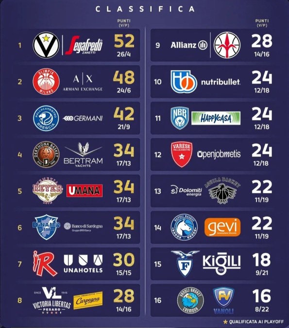 Ora inizia il bello. Terminata la Regular Season, in Lba andranno in scena i tanto attesi playoff, che decreteranno la squadra campione d’Italia. Nell’ultima giornata, poche emozioni: l’olimpia batte Venezia, la Virtus si impone su Brescia. Cremona lascia la A con una vittoria su Trento, la Fortitudo perde contro la Reggiana. Derthona sbanca Brindisi, Sassari fa lo stesso a Varese. Trieste, nonostante la vittoria conquistata su Treviso, non si qualifica ai playoff: ad occupare l’ottavo seed è Pesaro, che espugna Napoli e si qualifica per il post season.
