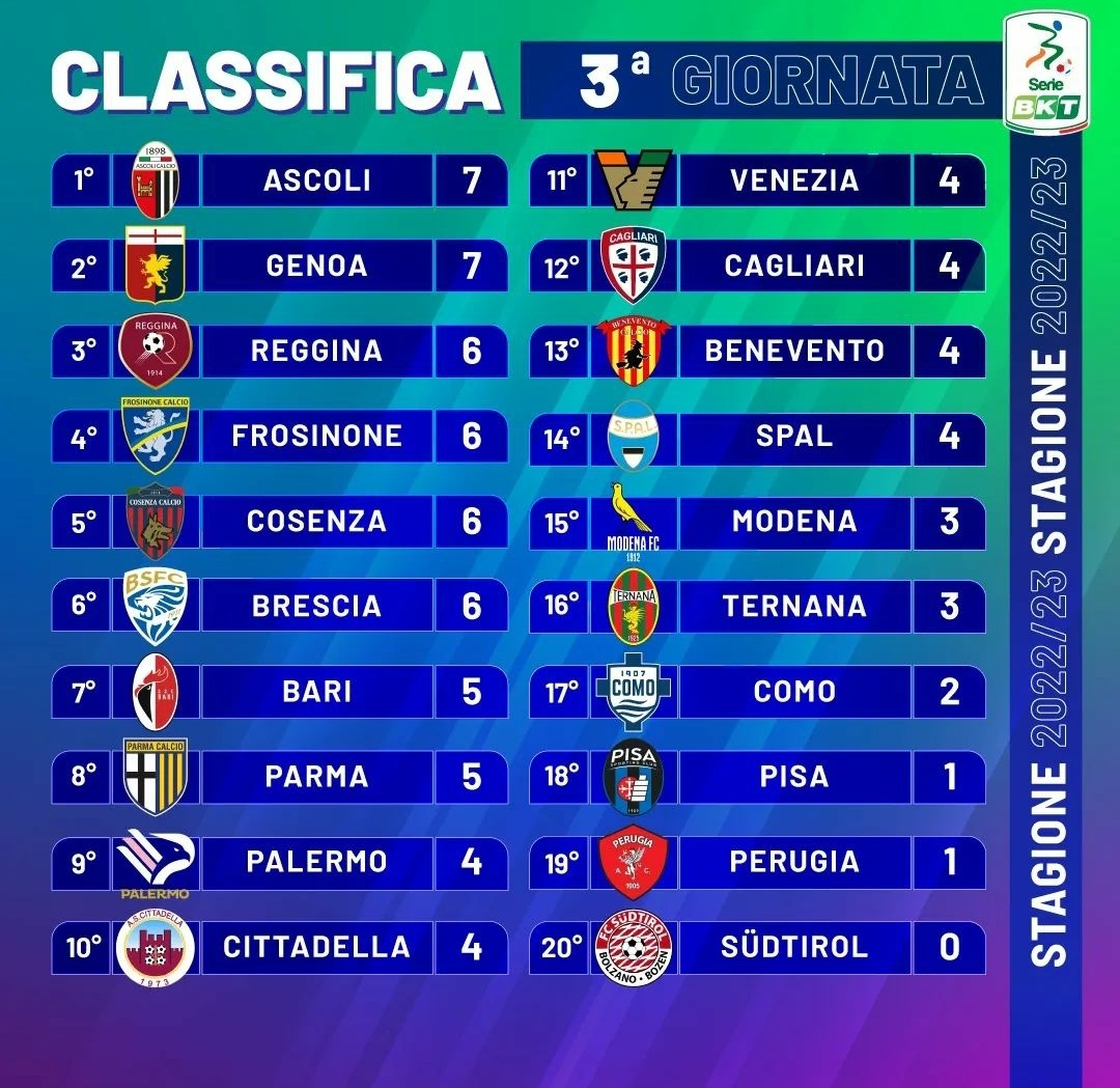 Si conclude la terza giornata di Serie B, giornata che ha visto cadere anche le ultime due superstiti rimaste a punteggio pieno e che ha stravolto, per la prima volta in stagione la classifica.l del campionato.