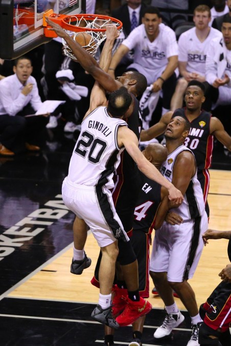 San Antonio vince la prima, perde la seconda, ma poi è un uragano. In Gara 5, il momento Ginobili della serie. Tiago Splitter cattura il rimbalzo, serve Manu che all’improvviso torna venticinquenne. A metà campo accelera all’improvviso, s’infila fra Ray Allen e Udonis Haslem, entra in area ed esplode una roboante schiacciata in testa a Chris Bosh.