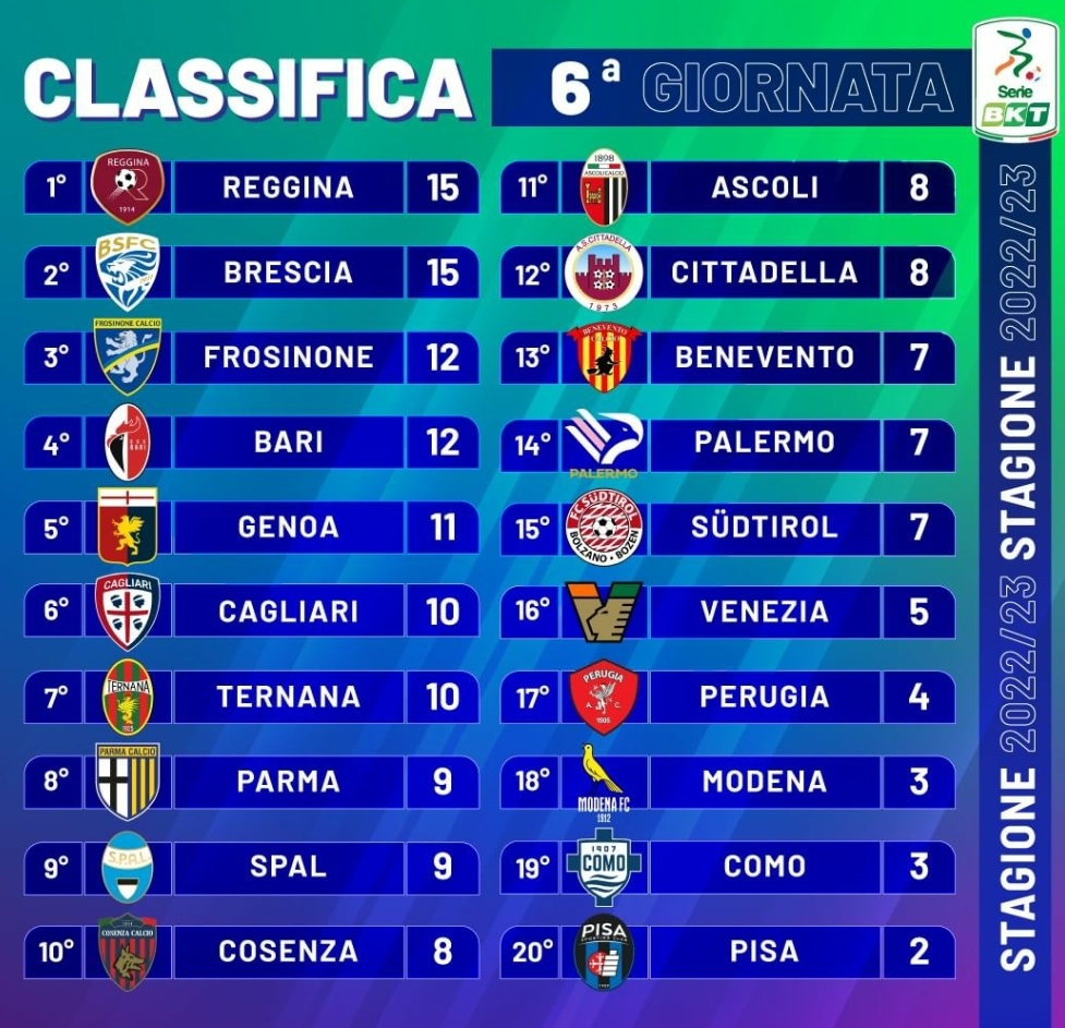 Vittoria di misura del Frosinone sul Palermo, 1-0 e ciociari che rimangono attaccati al treno delle prime. Stesso risultato per il Genoa sul Modena: grifone che si riavvicina alla vetta dopo un paio di uscite opache. Va di misura anche la Ternana nel derby umbro col Perugia, la squadra di Lucarelli è ora in zona playoff. Bene il Parma che passa 1-3 sul campo dell’Ascoli. Pareggio pirotecnico, tra Spal e Como finisce 3-3. È 1-1 tra Cosenza e Südtirol, così come tra le due delusioni della stagione finora, Venezia e Pisa.