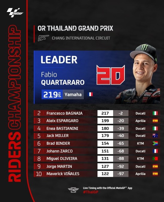 Francesco Bagnaia, nonostante un terzo posto, che potrebbe sembrare deludente se si pensa che il compagno di squadra Miller gli è arrivato davanti, non prende alcun rischio e porta a casa 16 punti, che visto lo zero di Quartararo, lo riportano a meno due dal Diablo, più staccato invece A. Espargaro, che si trova a meno venti punti dalla testa della classifica. Con tre gare da disputare, e una moto nettamente superiore rispetto alle altre, il pilota torinese diventa il favorito numero uno, anche perché la Yamaha non si è mai dimostrata competitiva; nulla è deciso dunque, adesso testa a Phillip Island, dove potrebbe avvenire il “sorpasso” decisivo.