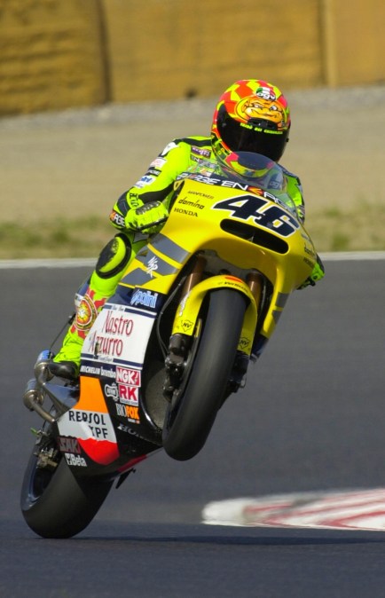Il mio dito si ferma su una data, 14 ottobre 2001. Valentino è al secondo anno in classe regina. Con un solo obiettivo in testa: vincere, dominare, sbaragliare la concorrenza. Ha i crismi del predestinato e le stimmate del campione: Tavullia ha per le mani un fenomeno. l’Italia ha per le mani un fenomeno. Amato e stimato, desiderato. Pronto, a qualsiasi sfida. Da affrontare sempre a viso aperto. Ed ecco che l’opportunità incontra il talento, e viceversa: dopo due mondiali già vinti, uno in 125, l’altro in 250, entrambi con l’Aprilia, a 22 anni la Honda lo accoglie nel mondo dei grandi, nella categoria 500, per sognare in grande, grandissimo. Un anno di apprendistato, condito da due vittorie e dieci podi e un secondo posto nel mondiale. Poi, il dominio incontrastato nella seconda stagione in sella alla Honda del team satellite nastro azzurro: 11 vittorie su 16 gare, 325 punti. La matematica certezza arriverà proprio in quel 14 ottobre 2001, a Philip Island, al termine di un finale al fotofinish per superare Max Biaggi, batterlo per 13 millesimi e consegnarsi al mito come primo italiano a vincere in tre diverse categorie, e come ultimo pilota a sigillare il proprio nome nell’albo d’oro della top class a due tempi.
