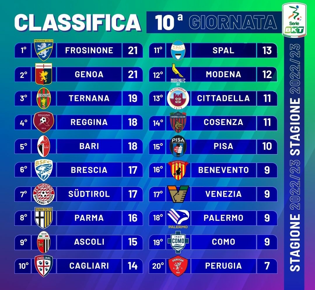 Continua l’ottimo periodo del Genoa che non perde dal 9 settembre e si appaia al Frosinone in vetta alla classifica. Termina il magic moment della Ternana che cade dopo 5 vittorie consecutive e scende in terza posizione.