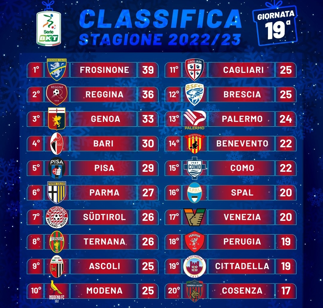 Con il “Boxing Day” si conclude l’anno solare per le squadre di Serie B e, con esso, il girone d’andata del campionato cadetto 2022/23. Si è arrivati ora al giro di boa: la classifica rimane cortissima, con le 20 squadre racchiuse in soli 22 punti e con la zona playout lontana solo 6 lunghezze dalla zona playoff. Tutte le squadre si trovano ancora, virtualmente, in gioco per il massimo obiettivo raggiungibile, la Serie A. Andiamo ora a rivivere cosa ci ha lasciato quest’ultimo turno giocato.