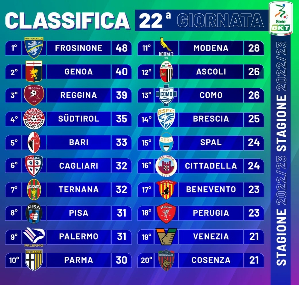 La ventiduesima giornata di Serie B va in archivio lasciandoci una classifica, fatta eccezione per la capolista, cortissima. Sono infatti solo 10 i punti a separare i fanalini di coda Venezia e Perugia, dall’ultimo posto valido per l’accesso ai playoff, occupato al momento dal Pisa. Andiamo ora a ripercorrere quest’ultima giornata, ricca di emozioni e sorprese.