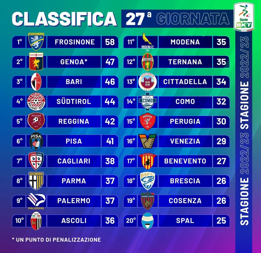 Biancorossi che con questi 3 punti si mettono ad una sola lunghezza di distanza dal Genoa secondo, mentre il Venezia conferma la propria crescita in questa seconda parte di stagione, ma rimane in zona playout.