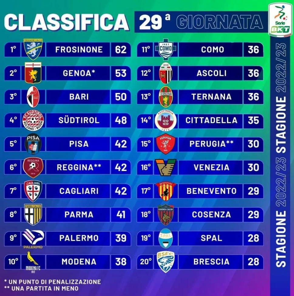 Pareggio che non cambia le ambizioni delle due squadre, il Frosinone è ora a +9 sulla seconda, mentre il Bari dista ora 3 punti dal secondo posto.