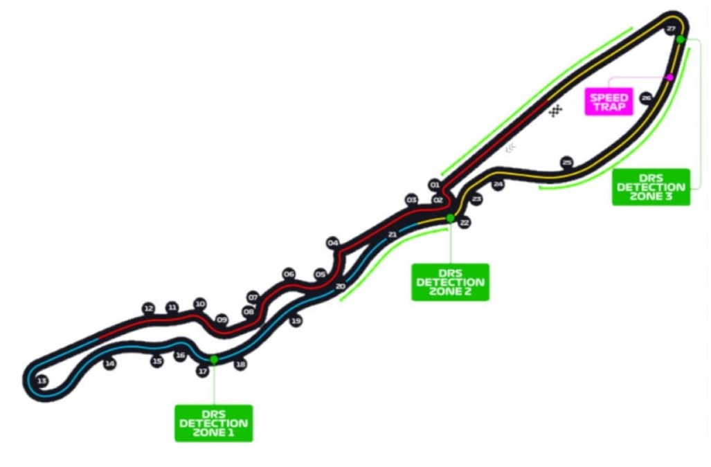 L’obiettivo principale degli organizzatori era quello di evitare di costruire un circuito cittadino classico, in cui è difficile sorpassare, infatti non vi sono alcune curve lente a 90° gradi. La sua fluidità e velocità lo rende il secondo circuito per velocità media in F1 con 252,8 km/h, secondo solo ai 264,3 km/h del tempio della velocità di Monza. In termini di lunghezza, le 27 curve fanno sì che sia il circuito con più curve in calendario, e il secondo più lungo con 6174 metri, dietro solo ai 7004 metri di SPA. Le zone DRS sono 3, nel rettilineo principale, tra le curve 20-21-22, e l’ultima zona è fra le curve 24-25-26.