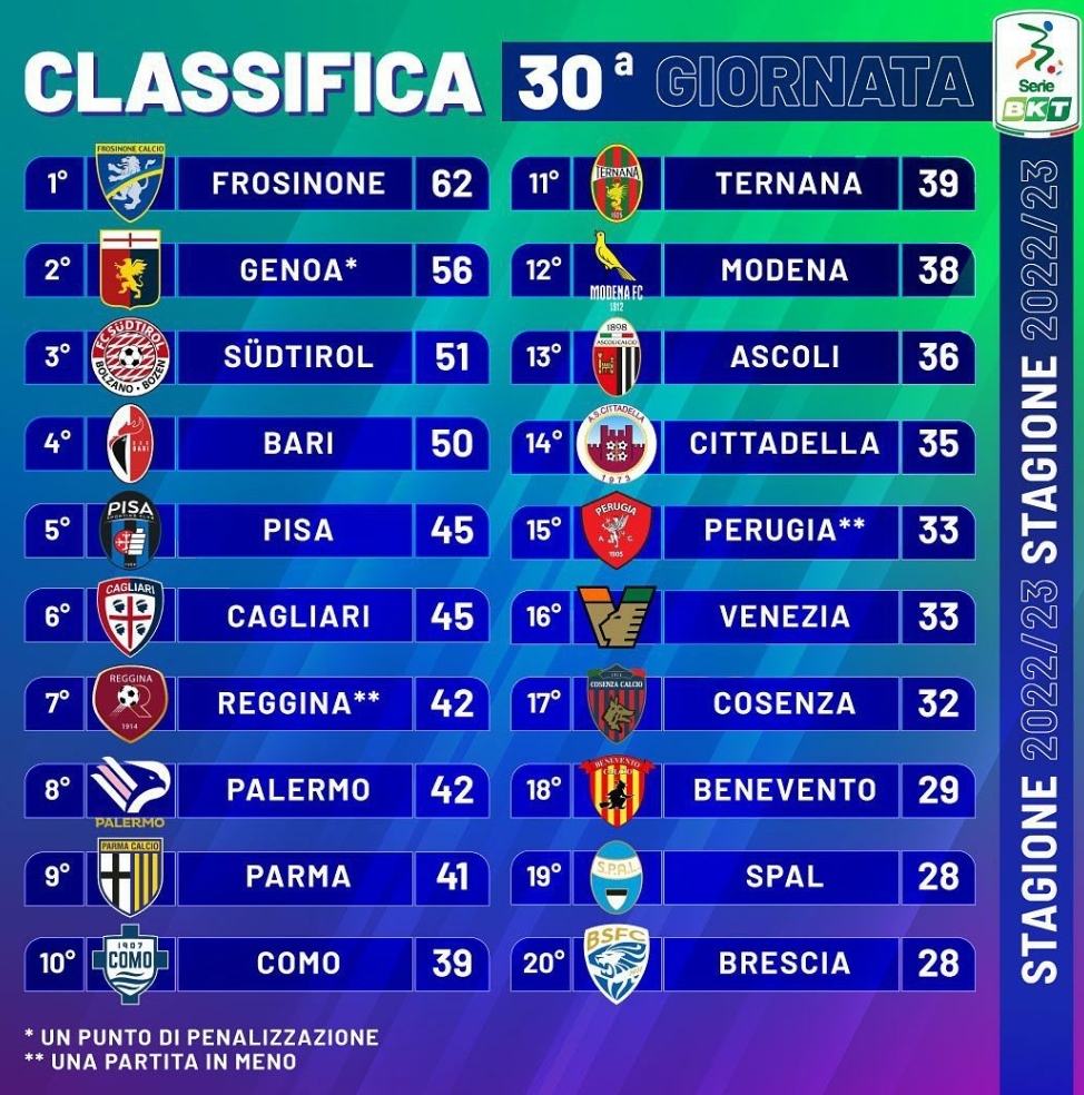 Con questa vittoria il Genoa consolida la seconda posizione e si avvicina al Frosinone, ora lontano 6 lunghezze. Per il Brescia continua invece la pessima stagione, rondinelle che non riescono a schiodarsi dall’ultima posizione in classifica.