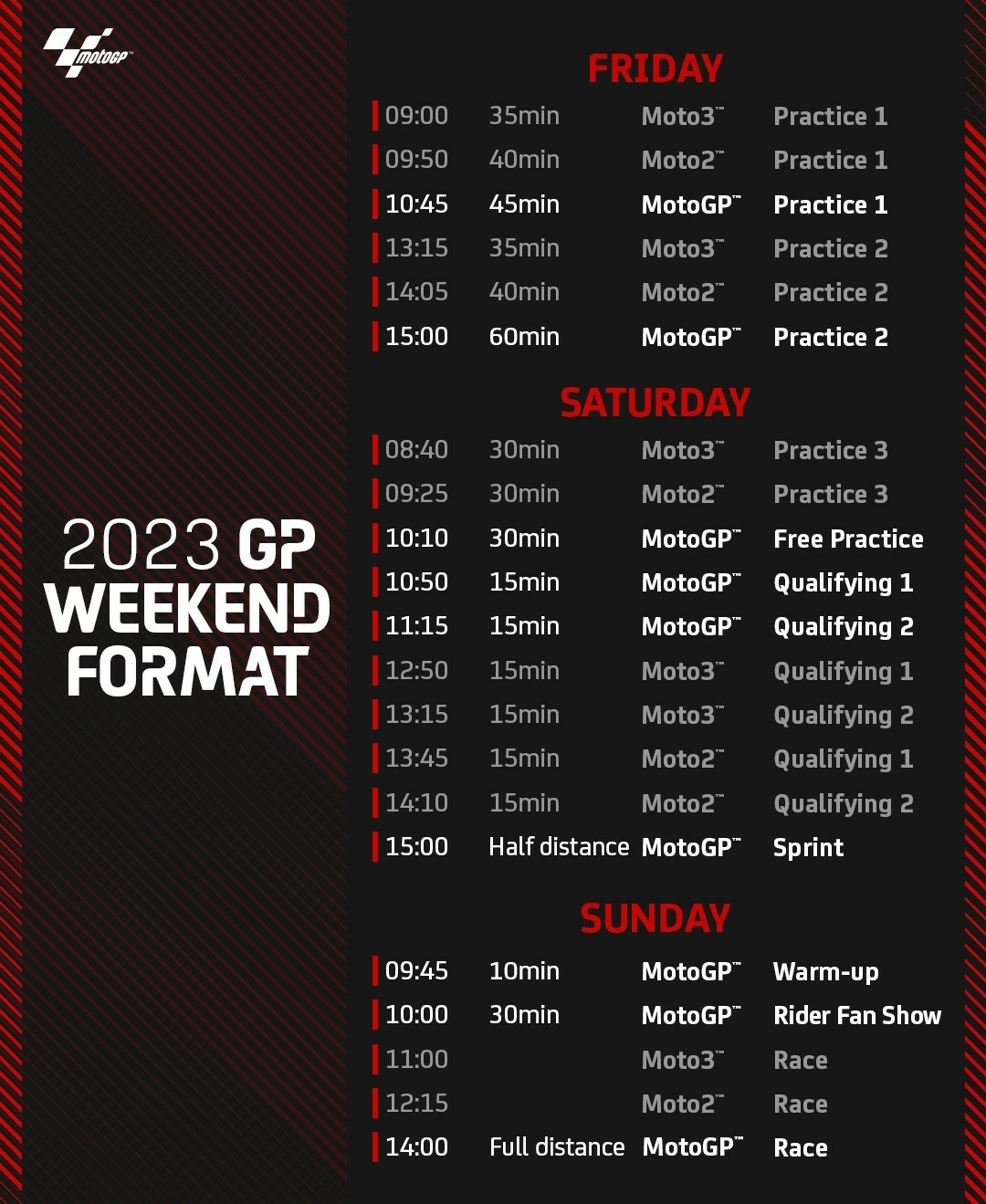 La stagione 2023 presenterà al mondo un format del fine settimana completamente nuovo, che prevede l’inserimento di una sprint race per ogni weekend, sprint che verrà disputata solo dalla classe regina e che assegnerà punti validi per la classifica iridata.
