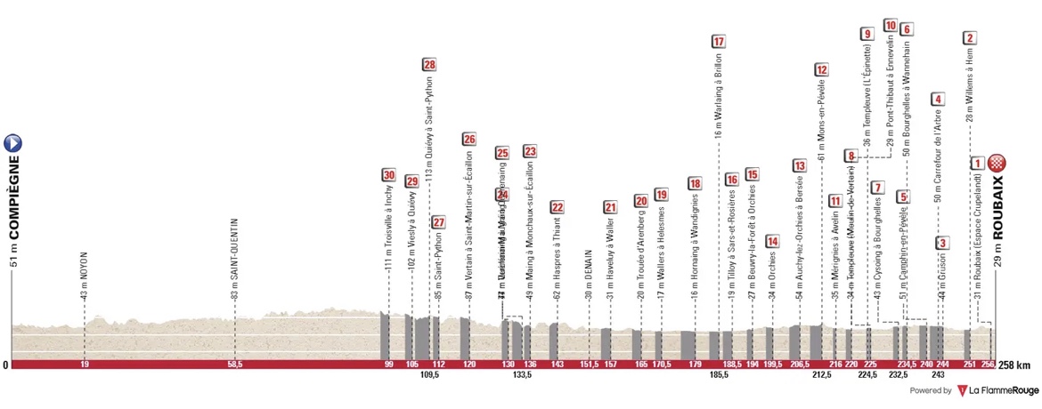 Gli unici cambiamenti avvengono naturalmente dopo circa 120 chilometri, quindi con ancora 135 chilometri da percorrere. Rimane invece invariato il tratto finale verso la pista di Roubaix. La partenza posta a Compiègne è orami diventata una tradizione, da qui i corridori partono per un viaggio infernale lungo 257 chilometri, che terminerà come da tradizione sul velodromo di Roubaix. Il tratto in pavé da Quiévy a Saint-Python è sicuramente tra i più impegnativi con le sue quattro stelle, e rappresenta un’assaggio del passaggio cruciale della corsa. I corridori passeranno successivamente nella Foresta d’ Arenberg, passaggio iconico della Parigi-Roubaix con una lunghezza di 2,3 chilometri. È posto a poco più di 95 chilometri dal traguardo, segna l’inizio del gran finale. Seguono altri diciannove tratti di pavé, due dei quali presentano cinque stelle di difficoltà. Quest’ultimi rispondono al nome di Mons-en-Pévèle e Carrefour de l’Arbre, il primo situato a 50 chilometri dal traguardo, e il secondo a circa 17 chilometri dal velodromo. Questi sono i tratti più duri, ma la reale difficoltà nasce dal susseguirsi di tratti in pavé che entrano nelle gambe dei corridori. Superato Carrefour de l’Arbre la parte più dura è finita, rimangono comunque tre tratti impegnativi: Gruson, Willems à Hem e Roubaix, dove è situato il traguardo. I corridori entrano nel velodromo, dove percorreranno un giro e mezzo. La storica campanella indicherà l’ultimo giro, dopo il quale un solo corridore alzerà le mani al cielo.