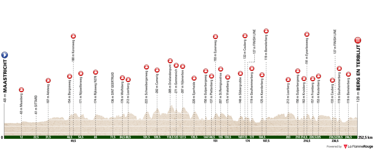 La prima parte dell’ edizione 2023 è leggermente differente rispetto alla scorsa edizione. I corridori partiranno da Maastricht, e si sposteranno più a nord fino ad arrivare a Sittard. Lungo la tratta, incontreranno diversi ostacoli a partire dal Maasberg, passando per Adsteeg, Bergseweg e Korenweg. Successivamente il gruppo ritornerà sul percorso originale. Trai 100 e 135 chilometri si trovano le salite più lunghe, tra cui Camerig e Drielandenpunt. Al chilometro 172 si verificherà il primo passaggio sul Cauberg, salita lunga 1,3 km con una pendenza media del 5.8%. Successivamente il primo passaggio sull’ arrivo da cui mancheranno gli ultimi ottanta chilometri. Il finale inizierà a circa quarantacinque chilometri dall’arrivo, con il Gulperbergweg. I corridori proseguiranno su strade strette fino ai piedi del Kruisberg, poco dopo si presenterà l’Eyserbosweg, seguito a gran velocità da Fromberg e Keutenberg. A circa 18 chilometri dal traguardo si figura per la seconda e ultima volta il Cauberg, da cui si infuocherà definitivamente la corsa. Geulhemmerberg e Bemelerberg saranno gli ultimi muri, la seconda cima di quest’ultimi è stabilita a sette chilometri dal traguardo. Dopo lo scollinamento i corridori punteranno la vicina Terblijt, dove solo uno di loro potrà gioire sul traguardo.
