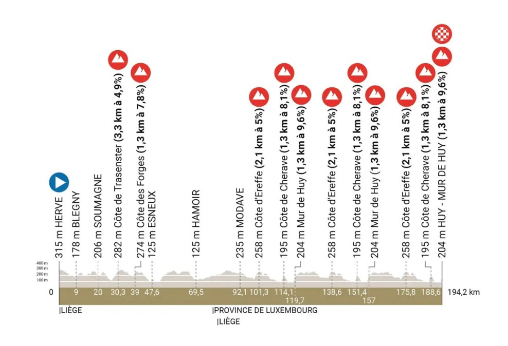 Quest’anno il percorso presenta delle leggere modifiche: i cambiamenti riguardano i primi 39 chilometri e la partenza è stata spostata da Blegny ad Herve. Da lì i corridori attraverseranno Blegny e Soumagne per arrivare alla nuova salita denominata Côte de Trasenster lunga 3,3 km con una pendenza media del 4,9%. Superato il primo muro di giornata al 39º chilometro si presenterà il Côte des Forges dove la corsa riprenderà la solita tratta. Il solito tragitto consiste nel passere per i classici paesi di Eseneux, Hamoir e Modave, contraddistinti da continui sali e scendi, e successivamente nel ripetere tre volte un circuito composto da tre insidiosissime salite. Il primo passaggio si figura a 93 chilometri dal traguardo, dove i corridori passeranno per la prima volta dal Côte d’Ereffe (2 km al 5,8%), che ormai da diversi anni gioca un ruolo fondamentale per il finale. Passeranno per la Côte de Cherave, una salita impegnativa, lunga 1,4 chilometri con una pendenza media del 7,9%, finendo sull’ iconico Muro di Huy, lungo 1,2 km al 10,4%, di cui gli ultimi 800 metri ballano introno al 15%. I primi due passaggi su quest’ ultimo muro sono fissati a 74 e 37 chilometri dall’arrivo, mentre il terzo e ultimo passaggio avverrà negli ultimissimi chilometri, dove posizionamento e tempismo saranno due elementi imprescindibile per il successo finale.