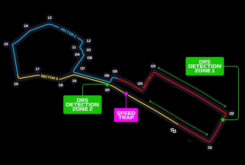Il circuito si percorre in senso antiorario. Ci sono ben venti curve, ma parecchi rettilinei. Infatti, è il terzo tracciato più lungo del mondiale, con i suoi 6003 metri. Di questi, 2,2 km sono rappresentati dal solo rettilineo principale. Anche per questo, su questa pista sono state rilevate alcune tra le velocità più elevate nella storia della F1, con picchi di 366 km/h. A causa degli oltre 3 km di rettilinei, per i team è fondamentale non perdere troppo carico aerodinamico, perché ciò comporterebbe una maggiore resistenza all’avanzamento. D’altra parte, però, ci sono ben venti curve da affrontare, quindi non bisogna esagerare né da un verso, né dall’altro.