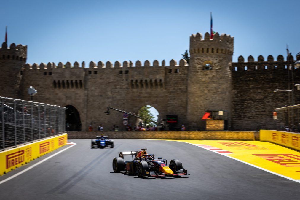 La formula Due giunge finalmente a Baku con un campionato apertissimo: Iwasa è primo, Pourchaire secondo e Vesti terzo ma separati di pochissimi punti dagli altri inseguitori per la corsa al titolo. Il weekend in Azerbaijan inizia con la sprint Race dove davanti a tutti partono Verschoor, Maloney e Martins. Si spengono i semafori e Martins cerca di inserirsi tra Verschoor e Maloney, ma li colpisce, Verschoor dopo il contatto prende il muro e rompe l’ala , mentre Maloney ha una foratura. Nel caos Hauger ne esce vincitore, si trova in prima posizione, seguito da Martins e Daruvala. Bearman sta risalendo dalla decima posizione, per lui inizia una gran rimonta. Al terzo giro Boshung si ferma, safety car. Al quinto si riparte senza attacchi ne contatti, anche se Vesti cerca di prendere Daruvala e nelle retrovie Nissany attacca Doohan. Il duello Vesti con Daruvala prosegue per diverse curve, il pilota della Prema sta studiando l’avversario, che sembra particolarmente bravo nel difendersi, e infatti Vesti non riesce e Daruvala allunga. Nel mentre Martins continua ad avvicinarsi a Hauger cercando di conquistare la prima posizione, ma il pilota norvegese tenta di scappare come può. Bearman sta volando alle spalle di Vesti, giro veloce dopo giro veloce sta guadagnando un secondo sul leader della gara. Vesti supera Daruvala e tenta di fare lo stesso anche Bearman, ma l’indiano si difende, però solo per qualche curva perché sul rettilineo Bearman sfodera il colpo finale e lo supera. Iwasa nel mentre ha problemi al DRS che non riesce a chiudersi, quindi rallenta tantissimo e è costretto al ritiro. A dieci giri dalla fine Hauger aumenta il passo e conquista il giro veloce, che gli viene tolto immediatamente da Benavides, posizionato in diciassettesima posizione. Vesti e Bearman si stanno avvicinando a Martins e a Hauger ma al quindicesimo giro Nissany impatta contro il muro e entra in pista la safety car. Alla ripartenza Hauger prende il muro, seguito da Daruvala, Martins, Pourchaire, Leclerc sono tutti costretti al ritiro compreso Doohan che non ha colpito il muro ma si è girato in testacoda in partenza. Nel mentre, in seguito al molteplice ritiro, Bearman è primo, Vesti secondo e Crawford terzo, la gara termina così sotto regime di safety car.