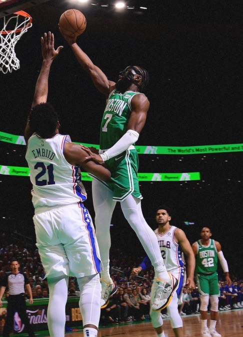 Terzo quarto che inizia con Embiid in difficoltà: sbaglia due canestri facili, perde una palla e, in generale, non si muove bene perché è ancora malconcio e sta giocando con una vistosa fasciatura sul ginocchio destro, infortunato nella serie contro Brooklyn. Nel frattempo Harden prende il rimbalzo che gli mancava per la doppia doppia, ma, soprattutto, Boston trova il suo nuovo massimo vantaggio: +14, con parziale di 11-5 nel quarto. Nove di questi undici punti portano la firma di Jaylen Brown.