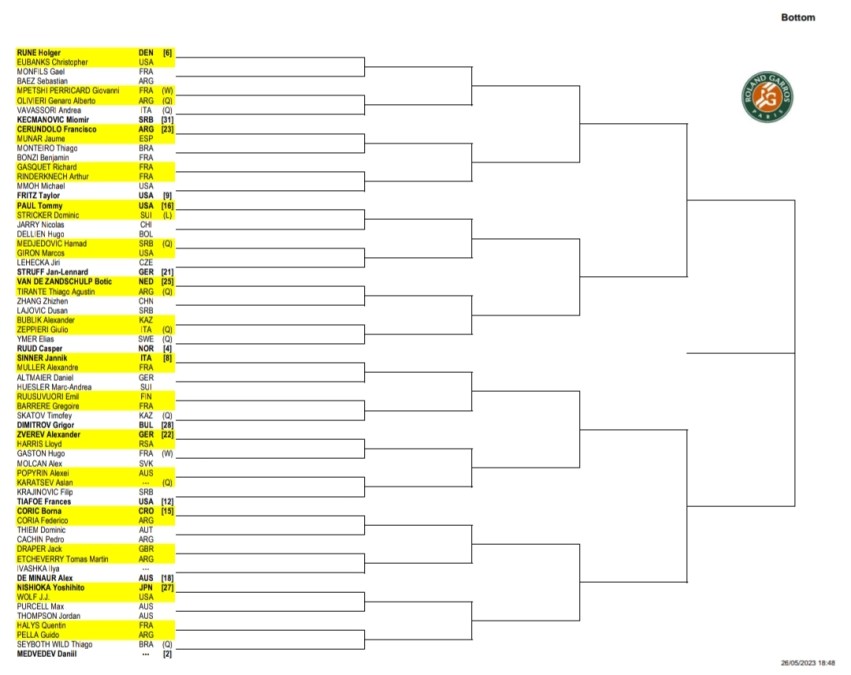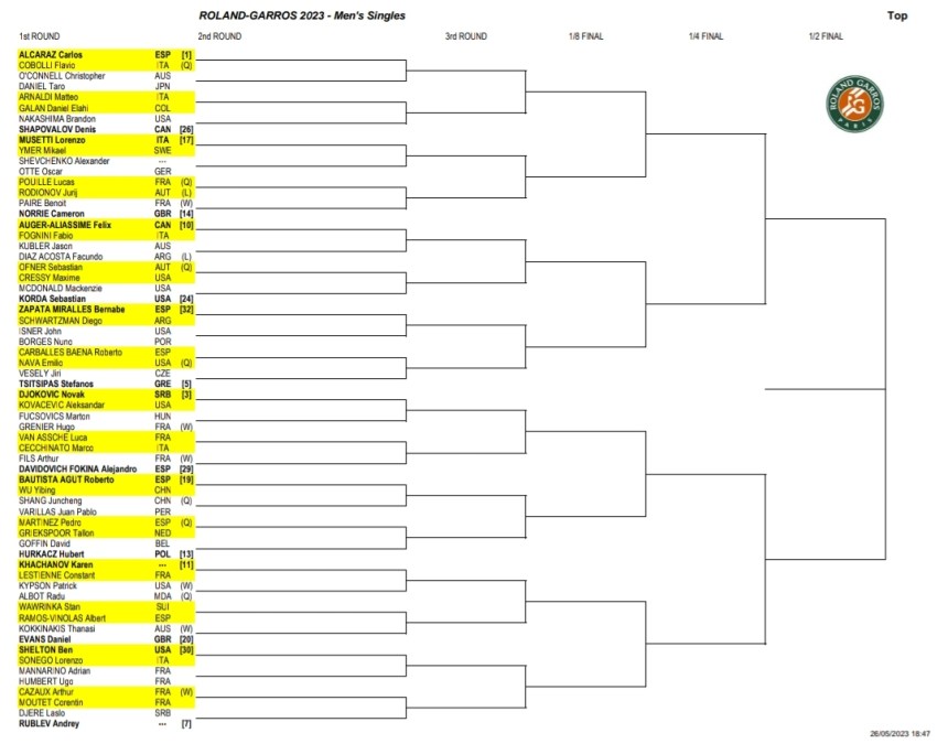 Riguardo al singolare maschile, con la rinuncia di Nadal si apre uno spiraglio per moltissimi tennisti, anche di seconda fascia. I principali favoriti, senza dubbio, sono Carlos Alcaraz – che arriva da numero 1 del mondo, reduce dalla vittoria del Masters 1000 di Madrid – e Novak Djokovic. Holger Rune, Stefanos Tsitsipas e Daniil Medvedev possono rappresentare delle insidie, più o meno pericolose. Un gradino più in basso ci sono l’italiano Jannik Sinner, il norvegese Casper Ruud (finalista uscente) e il russo Andrej Rublev (vincitore a Montecarlo). Il tabellone femminile, invece, è molto equilibrato e non presenta una chiara favorita. Partono con aspettative piuttosto alte Iga Swiatek, Elena Rybakina, Aryna Sabalenka e Maria Sakkari. Le italiane più quotate sono Martina Trevisan (semifinalista lo scorso anno), Camila Giorgi e Lucia Bronzetti. La spedizione tricolore in terra francese conta 15 unità (9 al maschile, 6 al femminile).