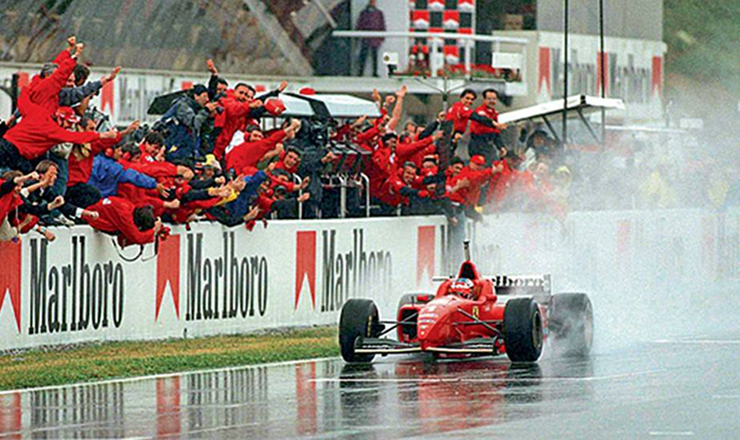 Irvine commette un errore andando in testacoda, ritiro per lui, mentre il compagno di squadra tedesco sorpassa Barrichello ottenendo il quinto posto, complice anche il fuori pista di Hill, Schumacher scala in quarta posizione. Il pilota della Ferrari è il più veloce in pista, supera anche Berger, Alesi e al 12° giro supera anche Villeneuve e diventa leader della corsa. Il resto della gara è un monologo firmato Schumacher, che riesce a vincere la prima gara con la Ferrari, distanziando di 45 secondi gli avversari. Ennessima volta che il Kaiser dimostra la sua abilità sull’asfalto bagnato.