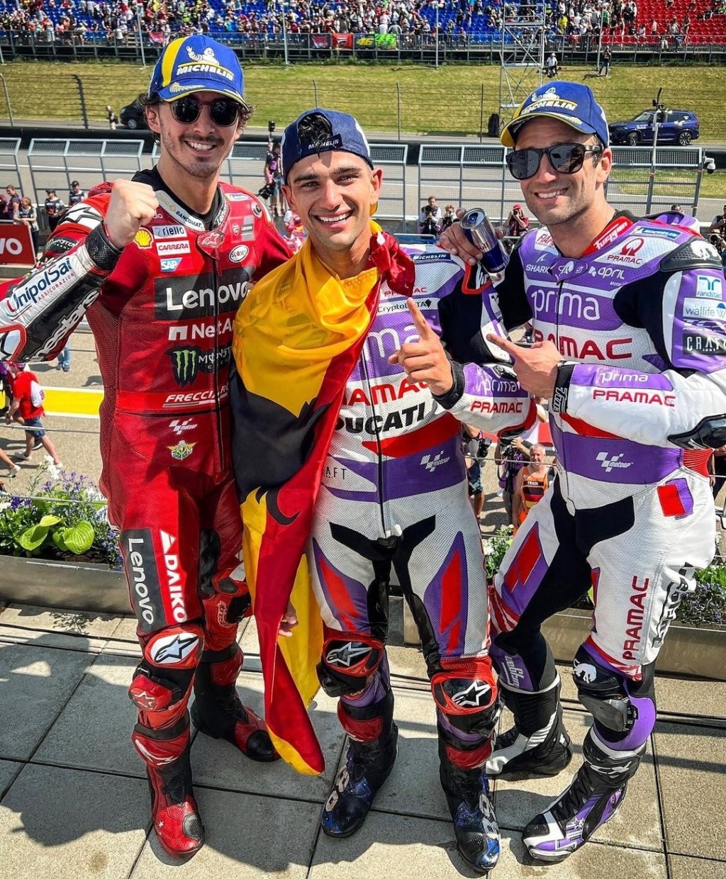 Si è da poco conclusa la gara di MotoGP, disputatasi sul circuito tedesco del Sachsenring. Martin vince dopo un bel duello con Bagnaia, e si porta a – 16 nel mondiale, proprio dal pilota italiano. Completa il podio Zarco, che si dimostra solido nella lunga distanza, completano la “scala reale” Ducati i due piloti del team Mooney VR46, Bezzecchi e Marini.