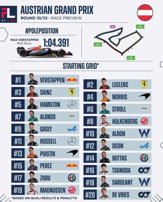 Si sono da poco concluse le qualifiche del Gp d’Austria, disputate sul circuito di Spielberg, che sono state condizionate dai numerosi tempi cancellati a causa dei “track limits”. Verstappen, come di consueto, conquista la pole position e Domenica partirà davanti a tutti. Ottima prestazione della Ferrari che piazza le due vetture, di Leclerc e Sainz, in seconda e terza posizione. Deludono Perez e Russell.